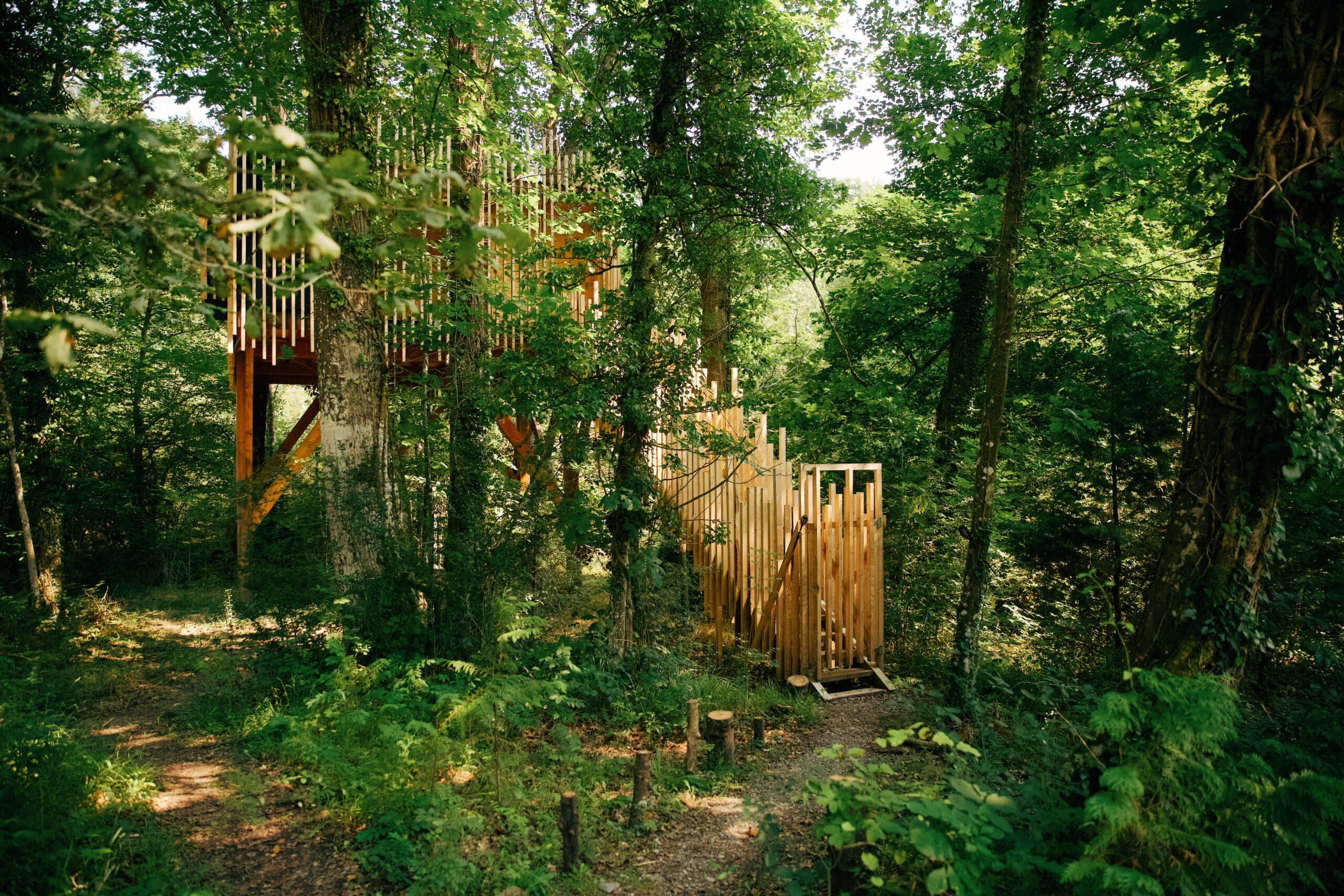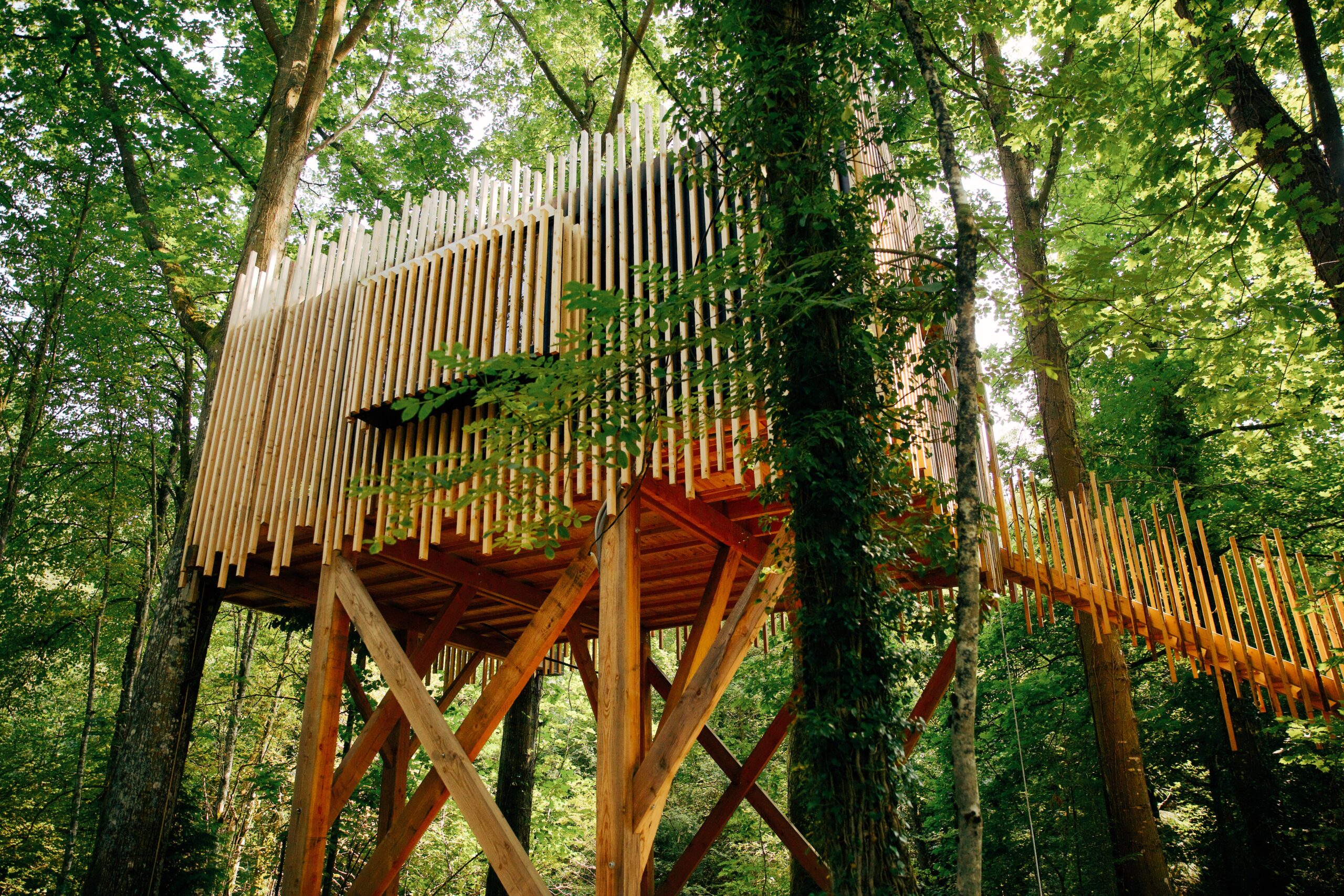 Cabaña construida sobre dos robles americanos y pilotes. Acceso con escalera amplia y cómoda.